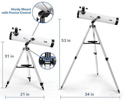 This astronomical telescope F70076 is easy to set up and ideal for viewing planets like Mercury, Mars, and Jupiter with clear detail. It features a sturdy aluminum tripod with an altazimuth mount for smooth vertical and horizontal movement. Suitable for both beginners and nature observation, it offers versatile use day or night. The telescope includes standard accessories such as 6mm, 16mm, and H25mm eyepieces, a 3x Barlow lens, a 1.5x erecting lens, and an accessory tray. Its 76mm aperture provides bright, sharp images for exploring the Moon and stars.