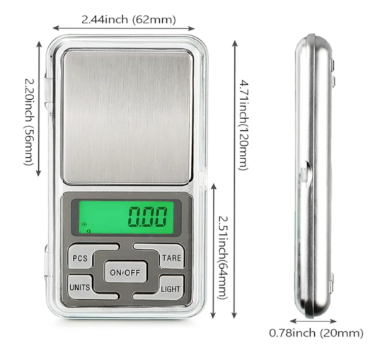 Jewelry Weighing Scale — 0.1g to 200g Pocket Precision Digital Scale with a Trendy Cell Phone Look. Suitable for accurate measurements in various industries such as jewelry and medicine. Features both weighing and counting functions, auto-calibration, and tare function. Compact and precise digital scale with a 200g capacity and 0.1g accuracy. Includes a 5-digit LCD display, auto power-off after 60 seconds and a low-battery indicator. Operates between 10°C and 30°C. Powered by 2×AAA batteries (included).Place on a flat, stable surface for accurate results.